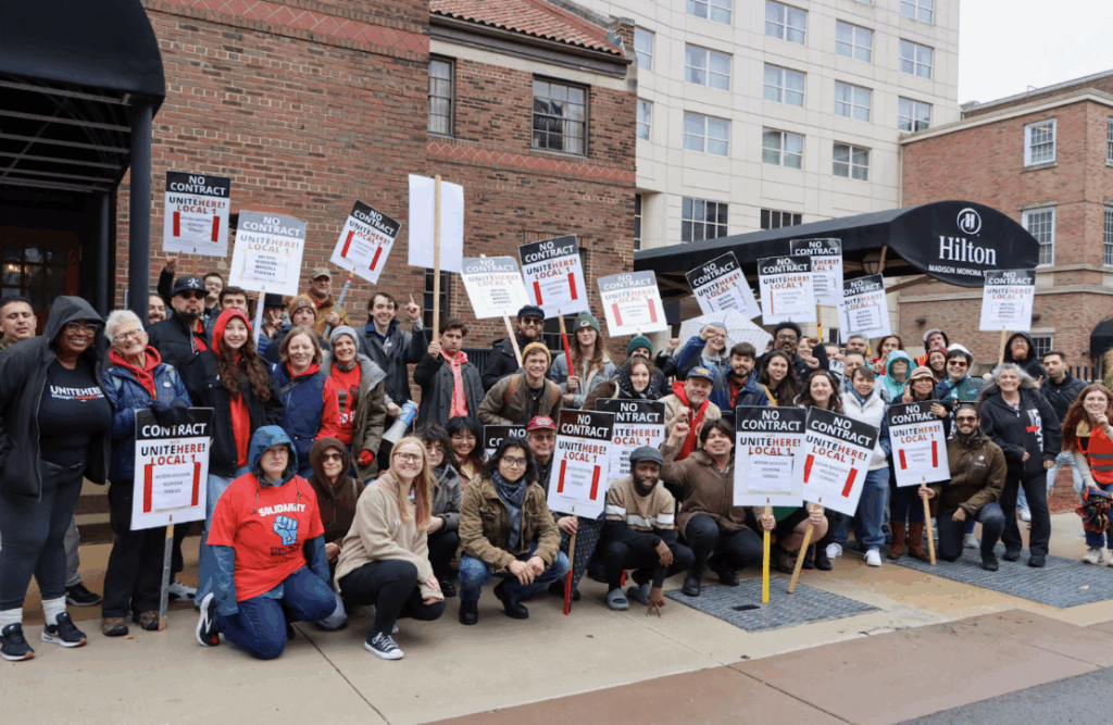 On October 25, Worker Justice Wisconsin members, staff, and community allies picketed in solidarity with the Hilton Monona Terrace employees in downtown Madison who are bargaining their first contract after unionizing in August. Over thirty people spent their Saturday morning marching up and down E Wilson St, chanting in English,